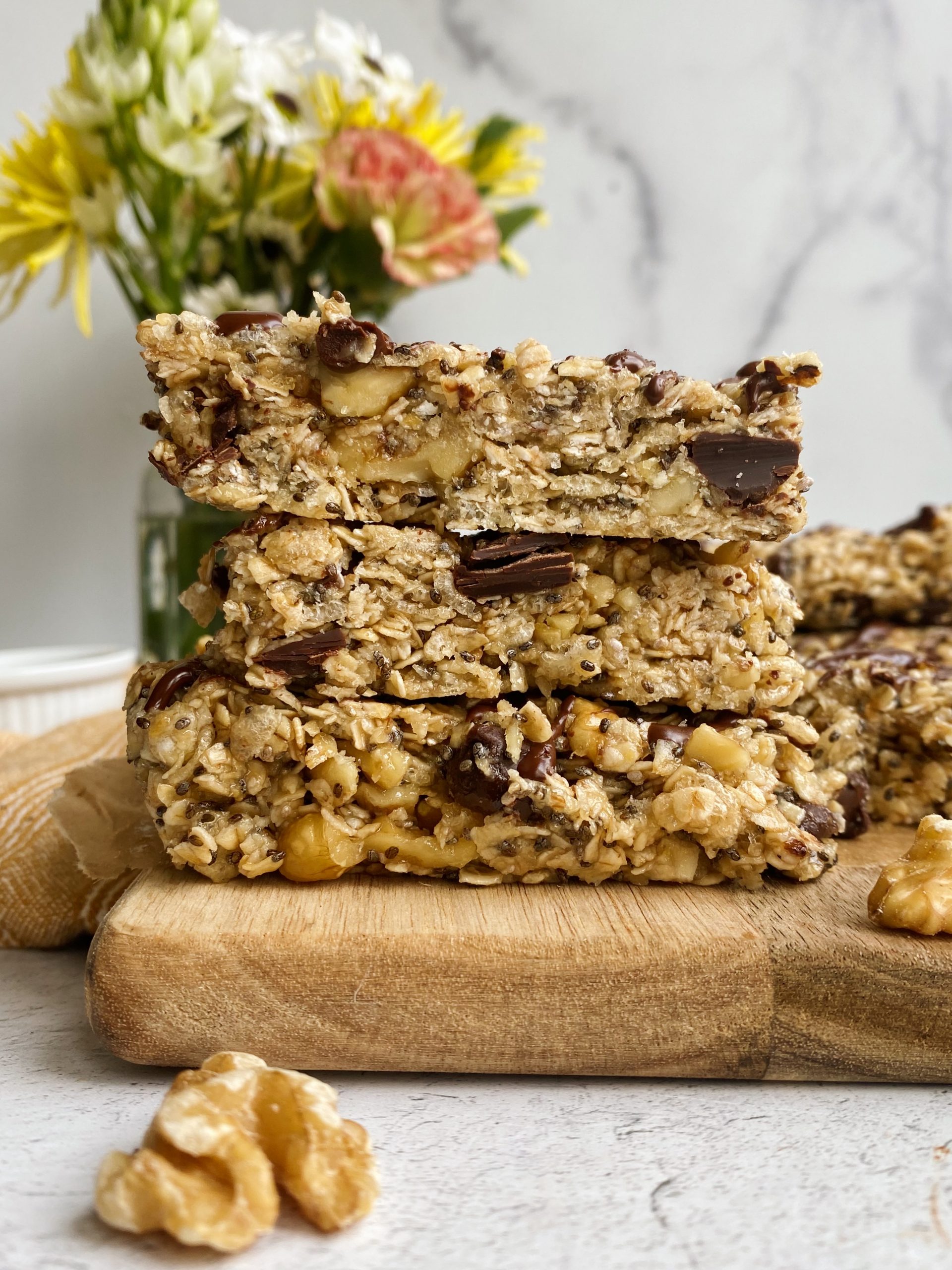 These no-bake dark chocolate and walnut granola bars with tahini are the simplest snack to prepare for the week, filled with whole-grains, healthy fats, and a little boost of protein!