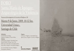 2009 — Santa María de Iquique: Una Arqueología de la Violencia — Symposium at UNIACC University, Santiago, 9th June 2009. Speakers: Andrea Jösch, Claudia Robles, Ignacio Acosta, Manuela Badilla, Pablo Artaza and Xavier Ribas. ... Events