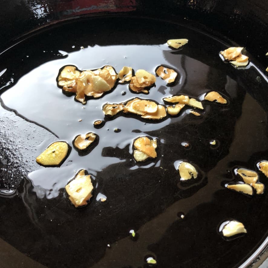 - Infuse the olive oil. Add the olive oil and garlic to a cold cast-iron or another heavy-gauge skillet and increase heat to medium. Saute the garlic until just perfectly golden brown and fragrant and remove the garlic from the pan and reserve.