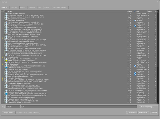 Voila! There are now hundreds of surf servers at your fingertips. Fortunately, many of the servers indicate their skill level. You can see the current map on the right side of the browser under the “map” column.