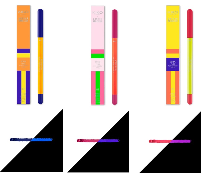 Matita labbra e corpo che diventa fluorescente se esposta alla luce violetta. Colore pieno e tratto preciso. Sono matite automatiche che non vanno temperate e che scorrono facilmente sulle labbra. Il loro colore è lievemente più acceso rispetto ai colori dei rossetti abbinati.