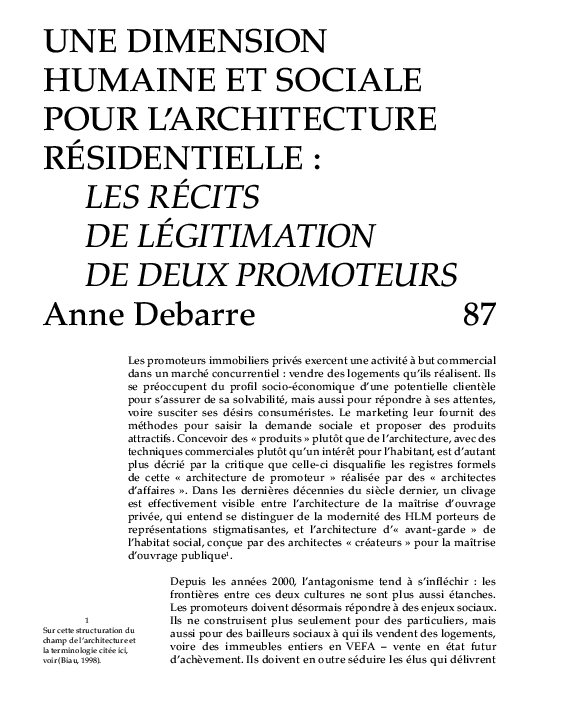 Rim Yassine KassabdownloadDownload free PDFUne dimension humaine et sociale pour l’architecture résidentielle : les récits de légitimation de deux promoteurs