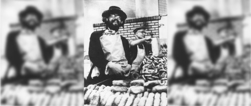 Selling bagels was common in Jewish communities, though the penalties for doing so without a license could be severe. Food writer Claudia Roden notes that in Poland, bagels were “sold on the street by vendors with baskets or hanging on long sticks. Hawkers had to have a license. Illegal selling of bagels by children was common and viewed as respectable, especially by orphans helping their widowed mothers, but if they were caught by a policeman they would be beaten and their baskets, bagels, and linen cover would be taken away.” (The Book of Jewish Food: An Odyssey From Samarkand to New York, by Claudia Roden, Alfred A. Knopf, New York: 1996.)