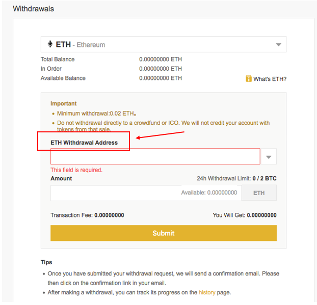 - From the drop down menu of “Select Withdrawal Coin”, click on “ETH Ethereum”.