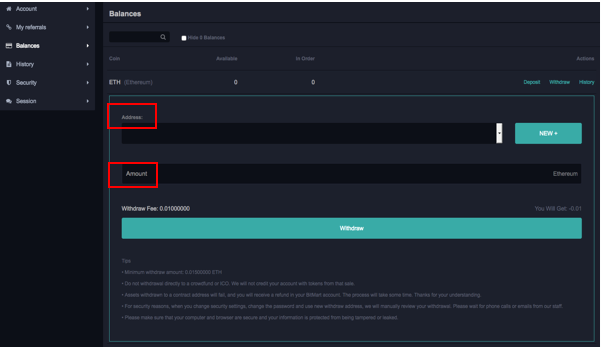 - For example, if you want to withdraw ETH, just click “Withdraw” for ETH. Input the address and amount, then click “Withdraw”.