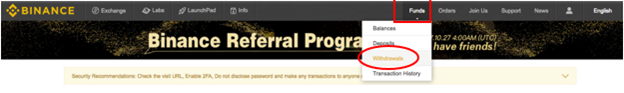 - Let’s use Binance as an example. After logging into your Binance account, click “Funds” on the upper right corner, then under the drop down menu, click “Withdrawals”.