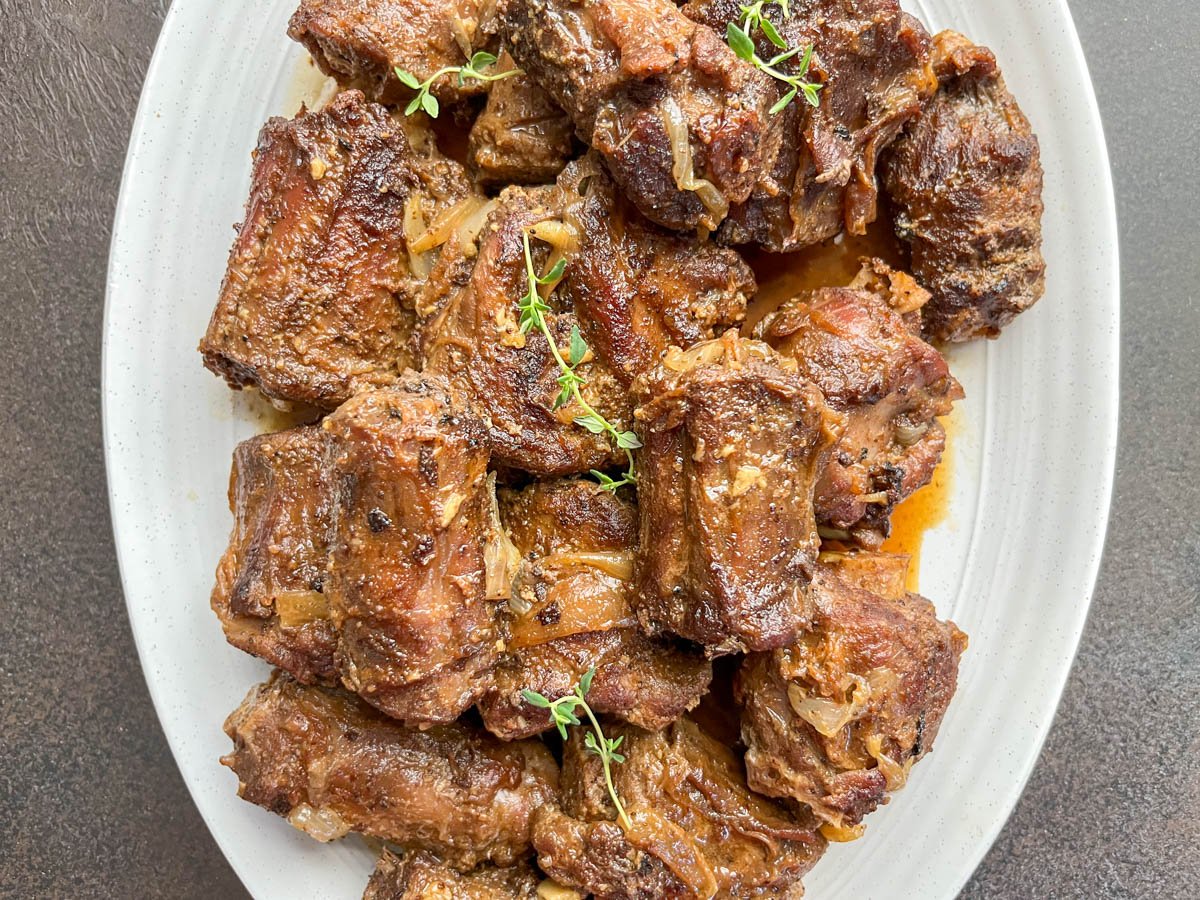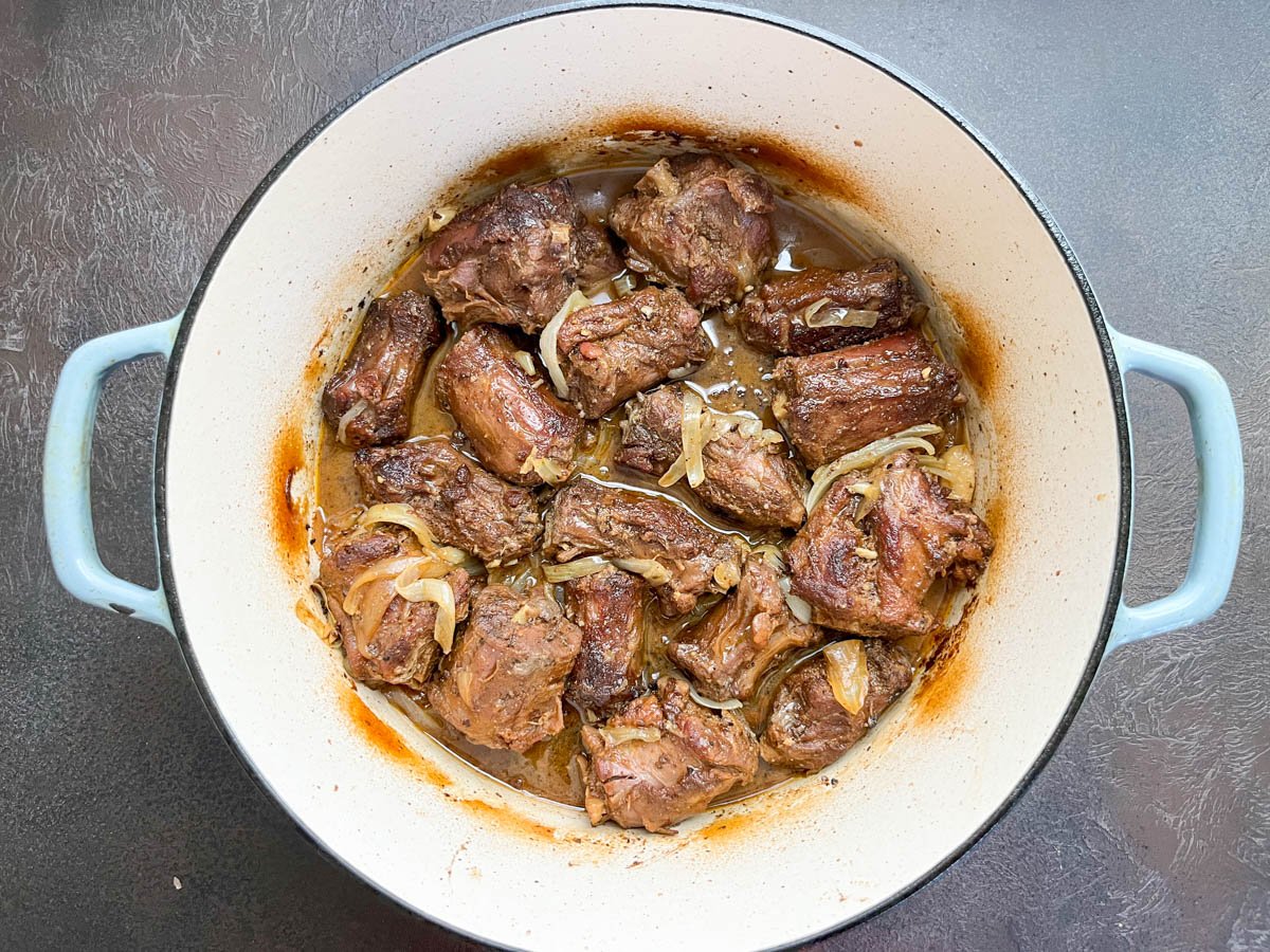I sear them until they're golden brown, then slow-braise them in a rich onion-infused broth until the meat is fall-off-the-bone tender and the sauce tastes like it simmered all afternoon.