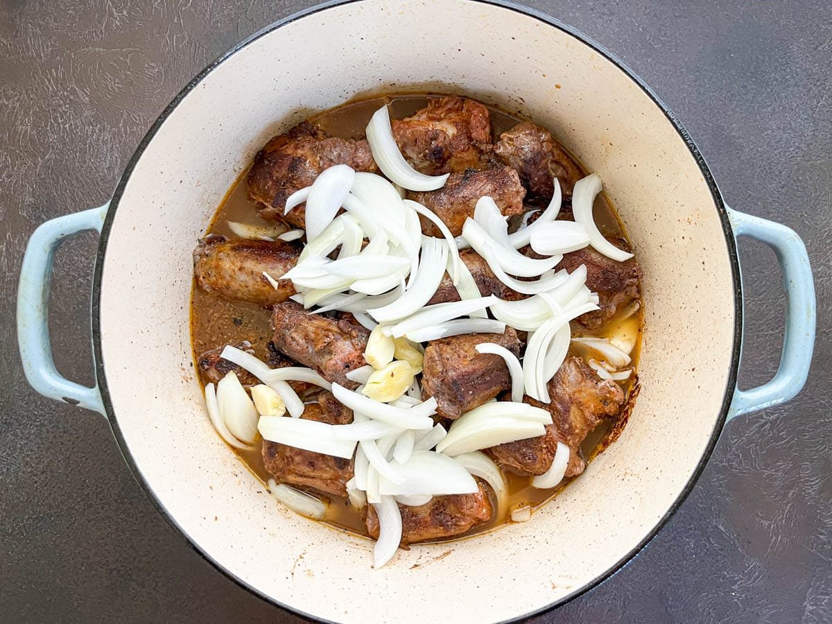 - Deglaze the skillet with the Better Than Bouillon mixture, then add the turkey necks back to the Dutch Oven and top with sliced onion.