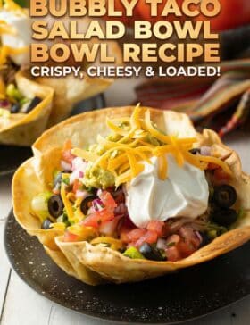 Make Amazing Taco Salad Recipes at home with these ultra-crispy Bubbly Taco Salad Bowls. Learn How To Make Tortilla Bowls (Taco Shells) just like your favorite Mexican restaurant… Without deep-frying!