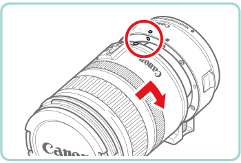 3. Attach the lens to the adapter. - To mount an EF lens, align the red dots on the lens and adapter, and then turn the lens in the direction shown until it clicks into place.