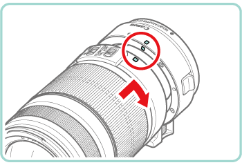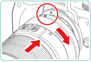 - To mount an EF-S lens, align the white squares on the lens and adapter, and then turn the lens in the direction shown until it clicks into place.