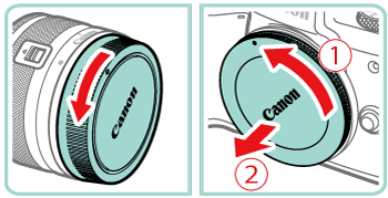 1. Make sure the camera is off. 2. Remove the caps.- Remove the lens cap and body cap by turning them in the directions shown.