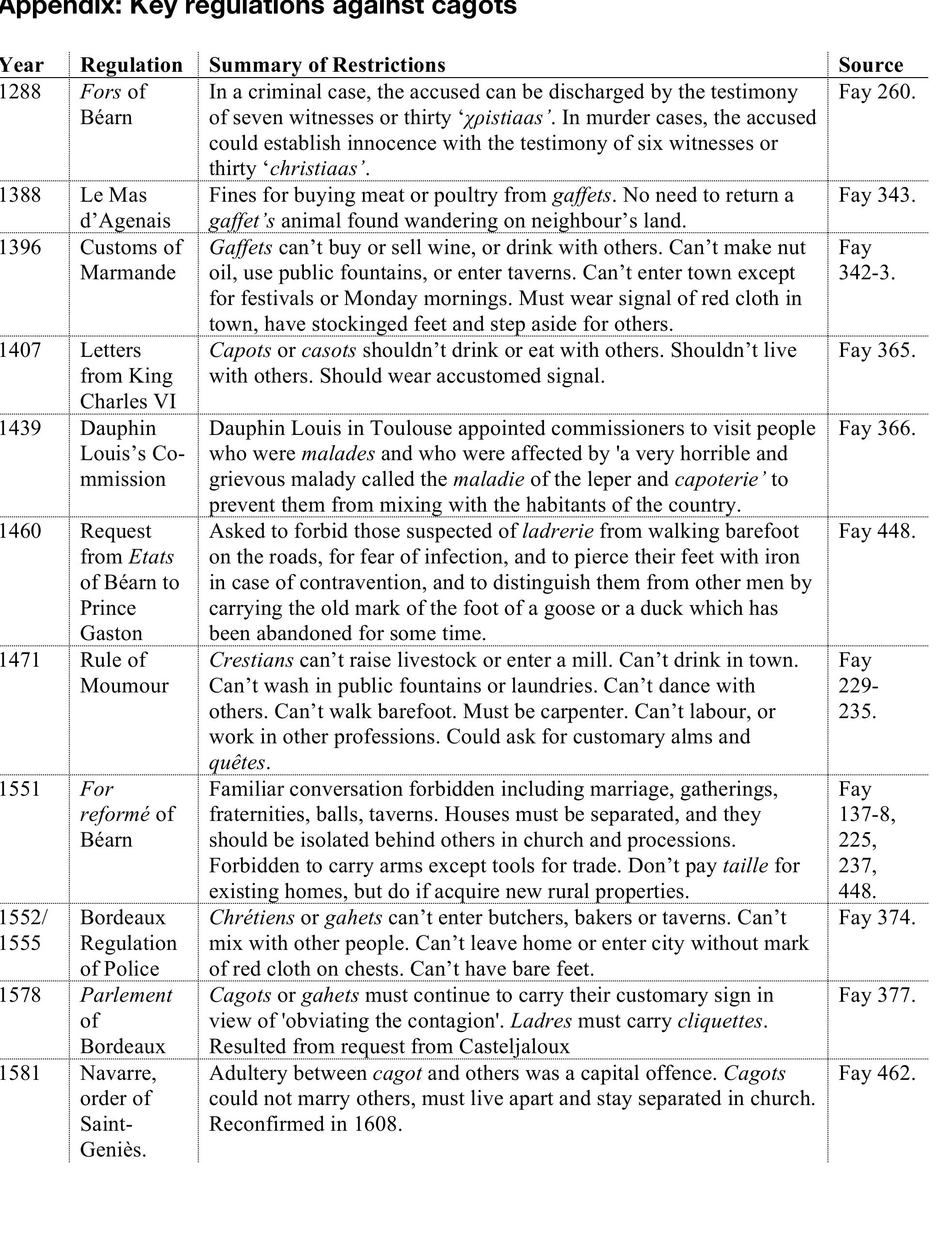 - Loubès. Gilbert. L'énigme des Cagots : histoire d'une exclusion. Luçon [France]: Sud Ouest, 1995. Luria, Keith P. "Separated by Death? Burials, Cemeteries, and Confessional Boundaries in Seventeenth-Century France." French Historical Studies 24, no. 2 (April 1, 2001): 185-222. doi:10.2307/826792.