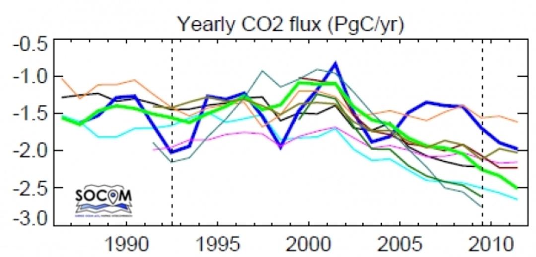 Du point de vue de l'évolution décennale du puits de carbone océanique, et en moyenne sur l'ensemble de l’océan, toutes les méthodes, sauf une, conduisent au même résultat, à savoir à un accroissement significatif du pCO2 océanique depuis 1985, lequel est proche de celui de la concentration moyenne du CO2 atmosphérique. Enfin, l'estimation des flux air-mer semble indiquer que le puits de CO2 océanique augmente depuis les années 2000.