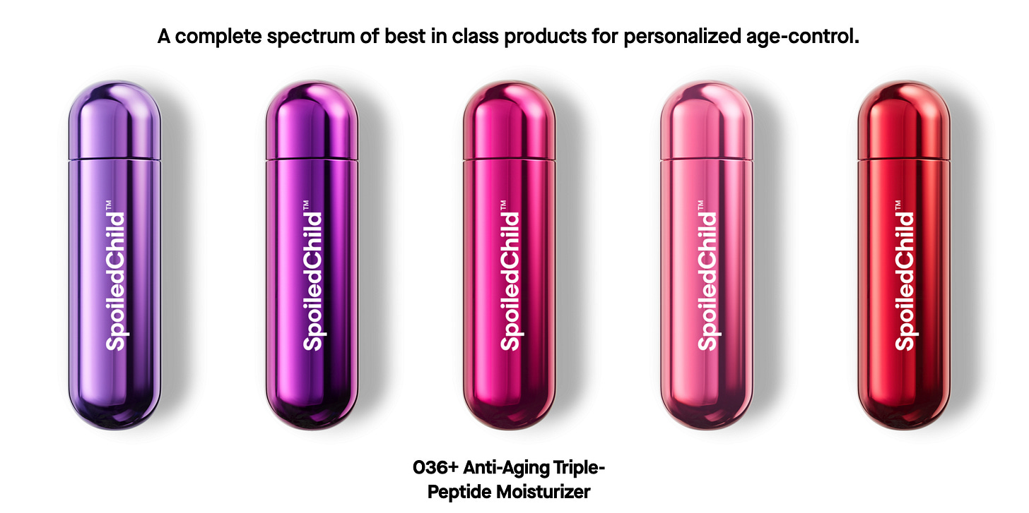The products, on the other hand — the only part of Spoiled Child that affects the customer in a material way — promise “anti-aging” and “fewer wrinkles.” They seek to “lift,” “rewind,” “firm,” and “instantly transform.” Those are serious (and all too familiar) claims.