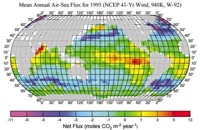 La durée de vie du CO2 atmosphérique est imposée par sa solubilité dans l’eau de mer, solubilité qui décroit lorsque la température augmente. Un flux est établi entre les océans tropicaux, qui dégazent, et les moyennes latitudes, qui dissolvent, en bénéficiant des vents d’altitude.