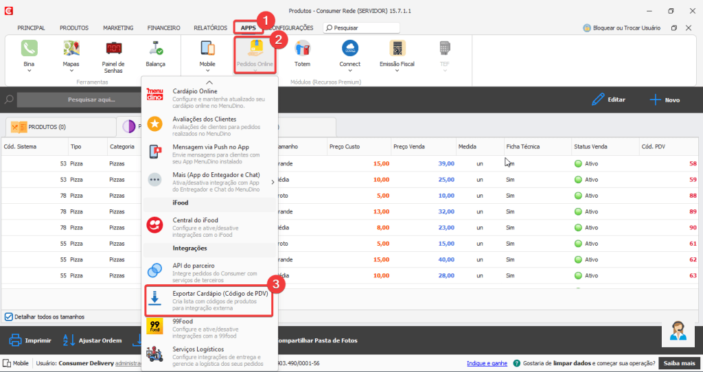 Agora, vamos efetivamente cadastrar os códigos PDV. Primeiro, vamos preencher os PDVs de cada tamanho. Para isso, é só acessar Apps -> Pedidos Online -> Exportar Cardápio – Código PDV: