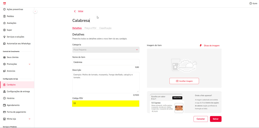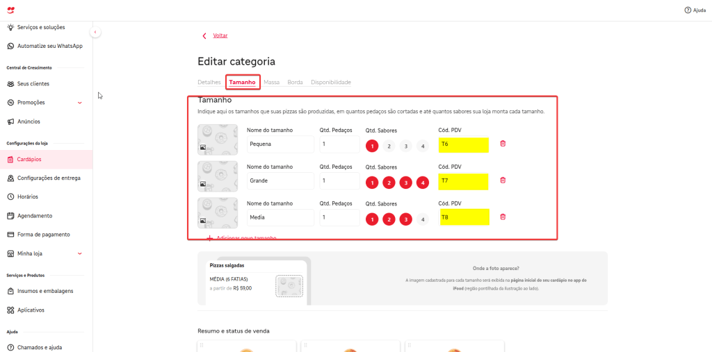 Agora, vamos preencher os códigos PDV de cada sabor de pizza no portal do iFood. Atenção: cada sabor possui um código PDV correspondente ao seu tamanho. No meu caso, por exemplo, a Pizza de Calabresa tem três códigos PDV, pois eu a vendo nos tamanhos Pequena, Média e Grande.