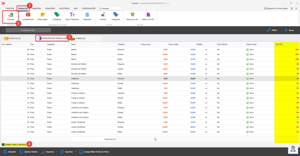 Veja acima que, ao detalhar os tamanhos, encontrei três códigos para a Pizza de Calabresa, um para cada tamanho. Faça da mesma forma com todas as outras pizzas e categorias, respeitando seus tamanhos específicos.