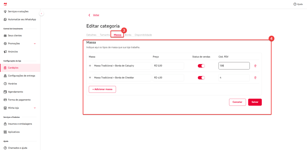 Devido a uma questão do iFood na integração, as bordas precisam ser cadastradas na aba “Massas” no portal do iFood, para que você possa inserir o PDV delas.