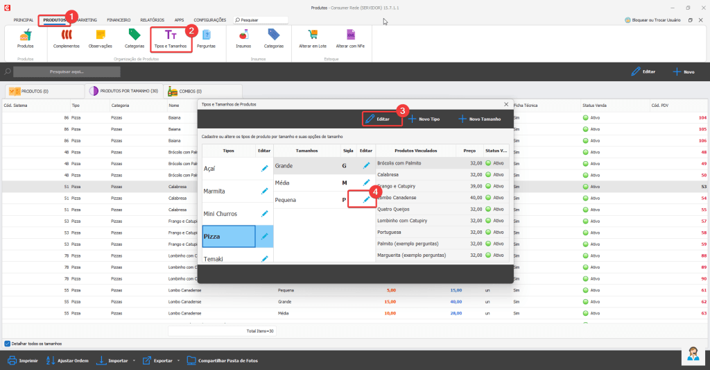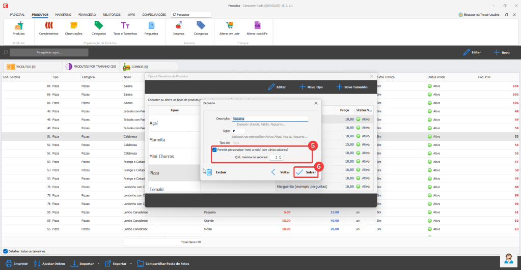 Pizzas pequenas geralmente têm apenas um sabor. Para obter o código PDV desse tamanho, ative temporariamente a opção ‘meio a meio’ no Consumer. Vá em Produtos -> Tipos e Tamanhos, selecione ‘Pequena’ e clique em Editar.