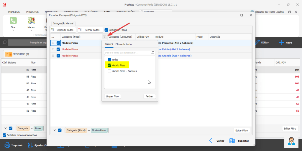 Em “Integração Manual”, clique no ícone do filtro e filtre por “Modelo Pizza” para obter o código PDV do tamanho broto: