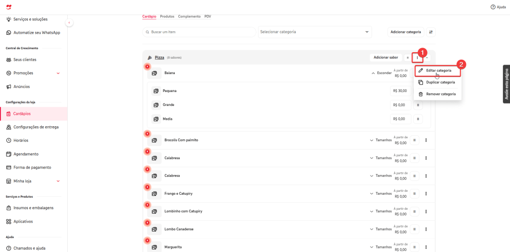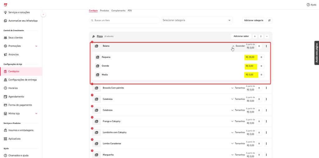 Acesse o portal de parceiros do iFood com seu e-mail e senha. No menu à esquerda, clique em Cardápios. Todos os tamanhos e sabores de pizza ficam dentro de uma única categoria com vários tamanhos, conforme o exemplo abaixo