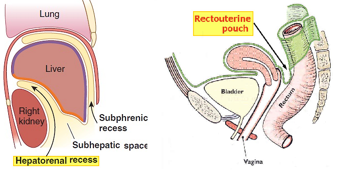 초음파 검사를 의뢰받은 영상의학과 의사는, 복막공간 & 골반공간에서 염증으로 인한 비정상적 물(fluid collection) 이나 출혈(hemorrahge)이 생겼는지를 초음파로 찾게 되는데, 이때 노련한 의사는, 배의 공간(복강, peritoneal cavity), 골반의 공간(골반강, pelvic cavity)에서 물이 제일 먼저 고일 수 있는 낮은 위치(dependent postion or pouch)에, 초음파를 우선적으로 검사해 보게 됩니다.
