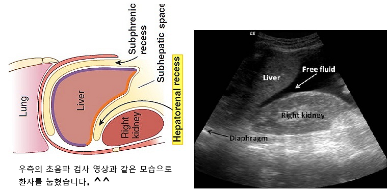 우측 초음파 사진에서, 상당의 많은 양의 abnormal fluid collection이 hepatorenal recess에 보입니다.