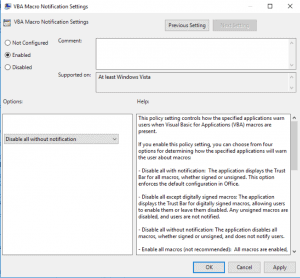 Double click on VBA Macro Notification Settings. Select “Enabled”, and change the dropdown to the setting you would like — “Disable All With Notification” is a good choice. Click OK.