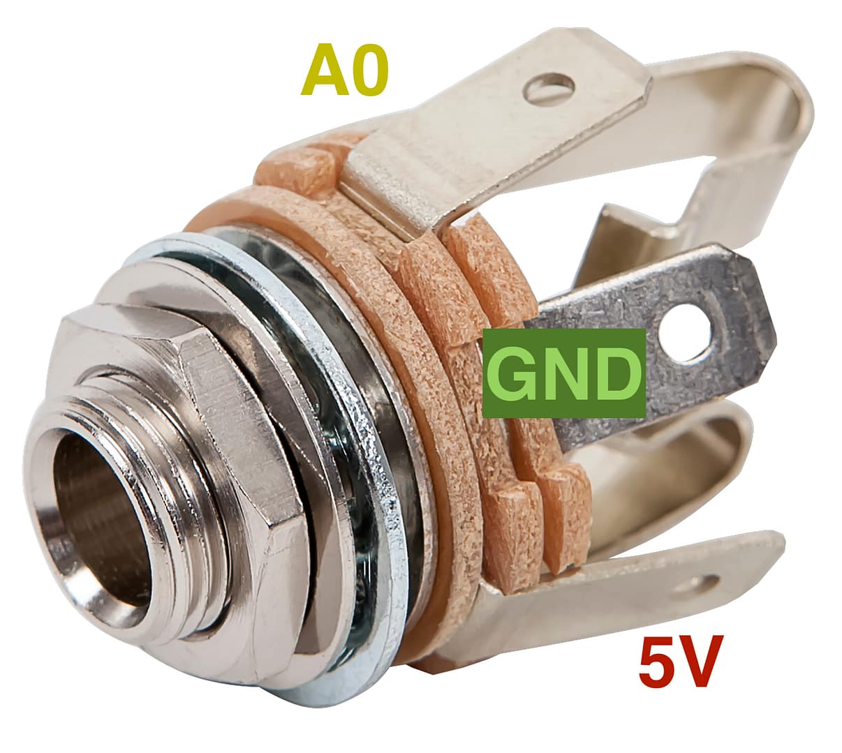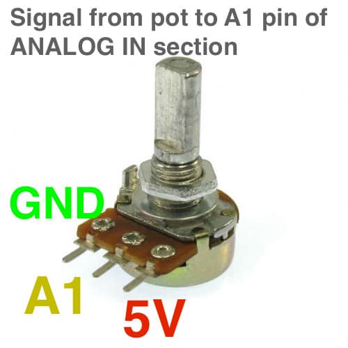 Add 2 Pots (linear b10k). Pots have 3 pins (5V, GND and Signal line). Signal lines for two our pots at Arduino side – ANALOG IN (A1 and A2, because A0 already connected for Expression input). 5V and GND we also connects as previously in POWER section to 5V/GND.