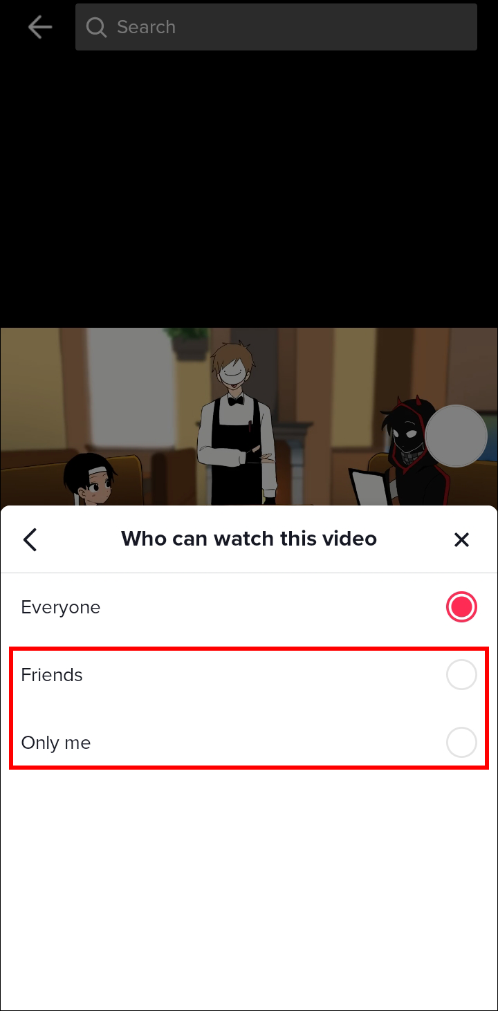 - Select “Friends” to limit the video to your followers whom you follow back. Tap “Only me” to make the video inaccessible to everyone but you.