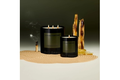 The Hinoki Fantôme Candle pairs a main course of cypress smoke with sides of warm amber, sweet vanilla, florals, and fresh moss.