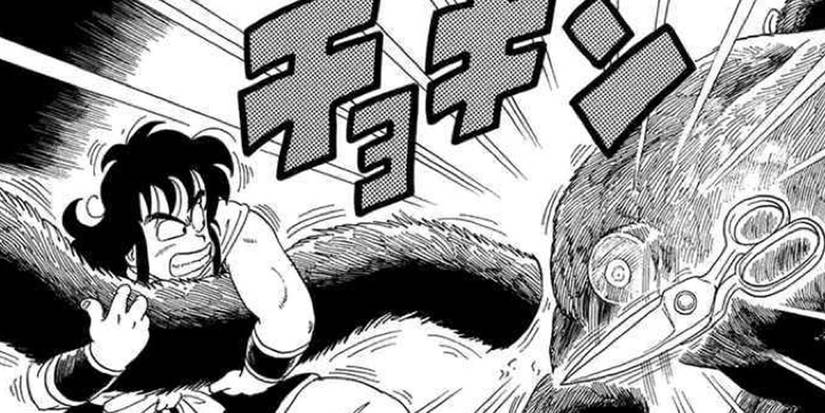 Having noticed that Goku’s tail was his weakness earlier in the arc, Yamcha reasons that removing Goku’s tail should reverse the transformation. If nothing else, it’s their only hope in subduing their enraged friend. Having Puar transform into a pair of scissors, Yamcha snips off Goku’s tail to bring the Monkey King down to size for the very first time.