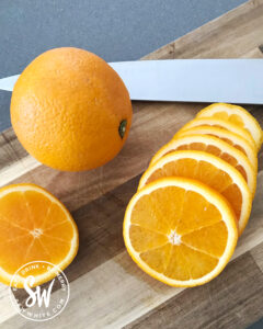 - Slice the oranges into 5-8mm slices. It looks thick but when they dry out they will go a lot thinner.
