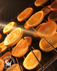 Simply slice the oranges into even slices. Please be careful when using knives. Dab as much of the juice off as you can, use a sheet of kitchen roll to dab off the juice. Place then slices on to the shelves of the oven. This helps the air get around them top and bottom. If they are on a baking tray it will take a lot longer as the air can’t get all the way round them.