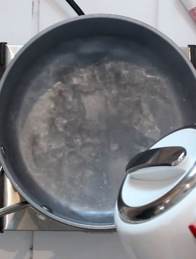 The first step is to add boiling water to a saucepan and put a large bowl on top of it.