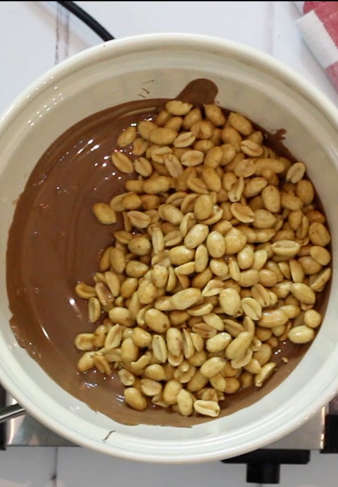- Once the chocolate has melted stir in the peanuts and mix until they are all coated.