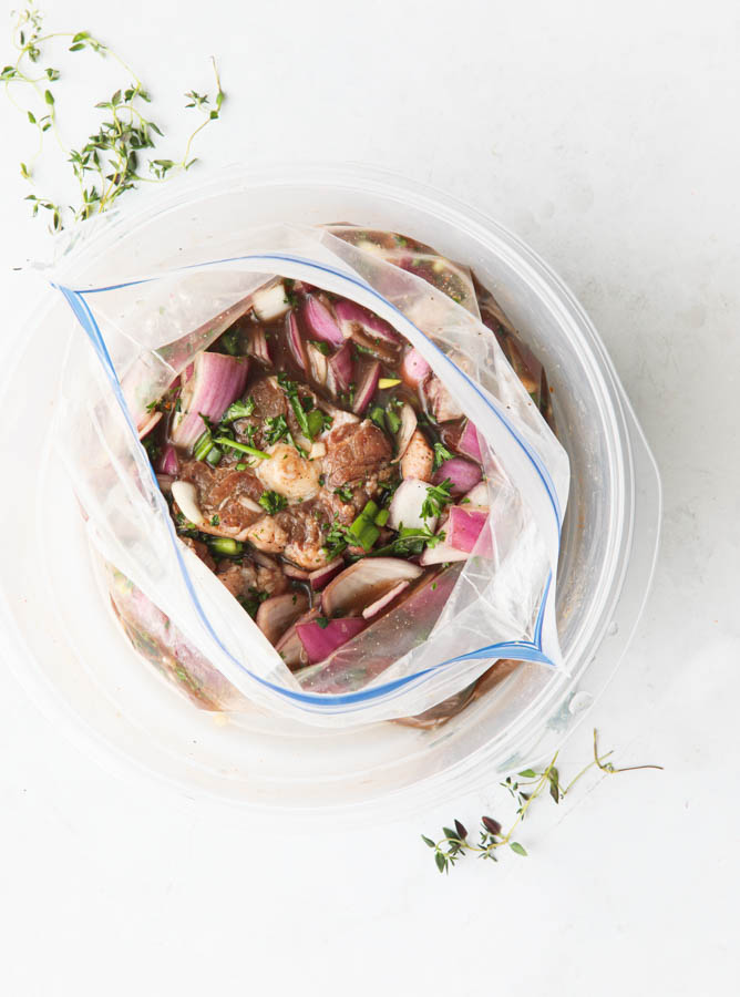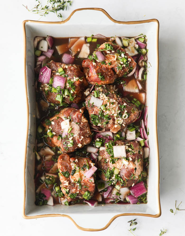 - Marinade Oxtail: Toss all (except the butter and slurry) your ingredients in a large plastic bag, jostle it around a bit to get everything covered, release the air from the zip bag and then let it sit in the fridge overnight. Don’t have a zip bag? Use a large container or a baking dish, as shown below. Cover with a top, plastic wrap or aluminum foil, but you’ll have rotate oxtail half way through marinating process and with a spoon pour the liquids and vegetables over the oxtails. This will infuse all those flavors into your oxtails.