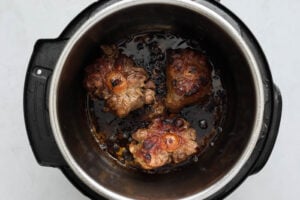 Step 3: Remove your room temperature oxtails from the marinade bag and pick out any garlic or onions that are stuck to them. Add some olive oil into the instant pot. Now brown them on each side.