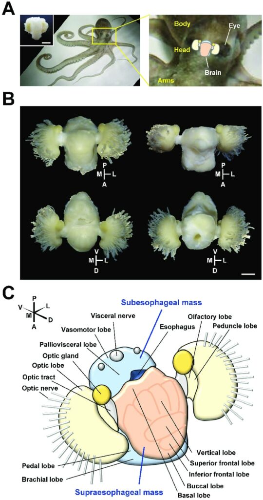 Nine. One central brain and eight mini-brains (satellite-brains) in each arm. This decentralized intelligence lets each arm “think” on its own—grabbing food, navigating the substrate, and even resisting detachment reflexes if severed.