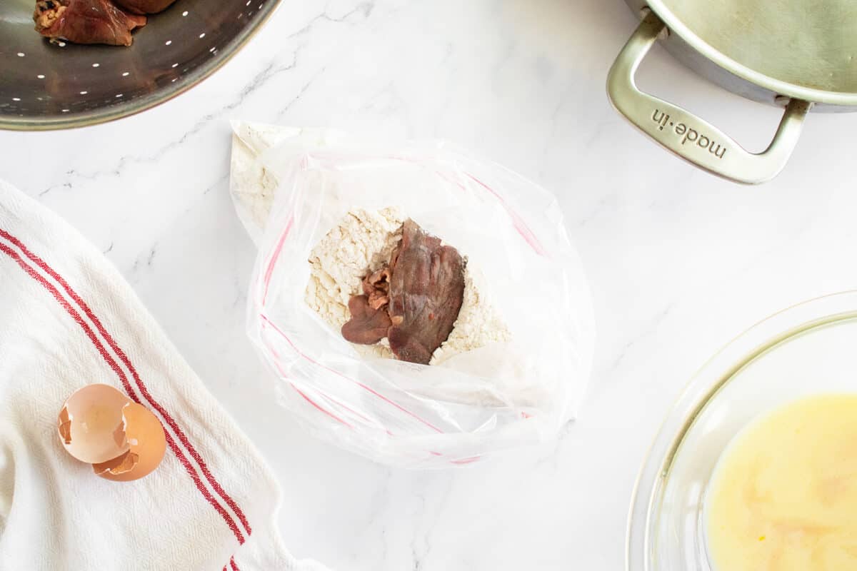- Take one chicken liver at a time and pierce it with a fork or toothpick all over. Then dunk it in the egg milk mixture then put it in the bag with the flour mixture shaking it to coat it well.