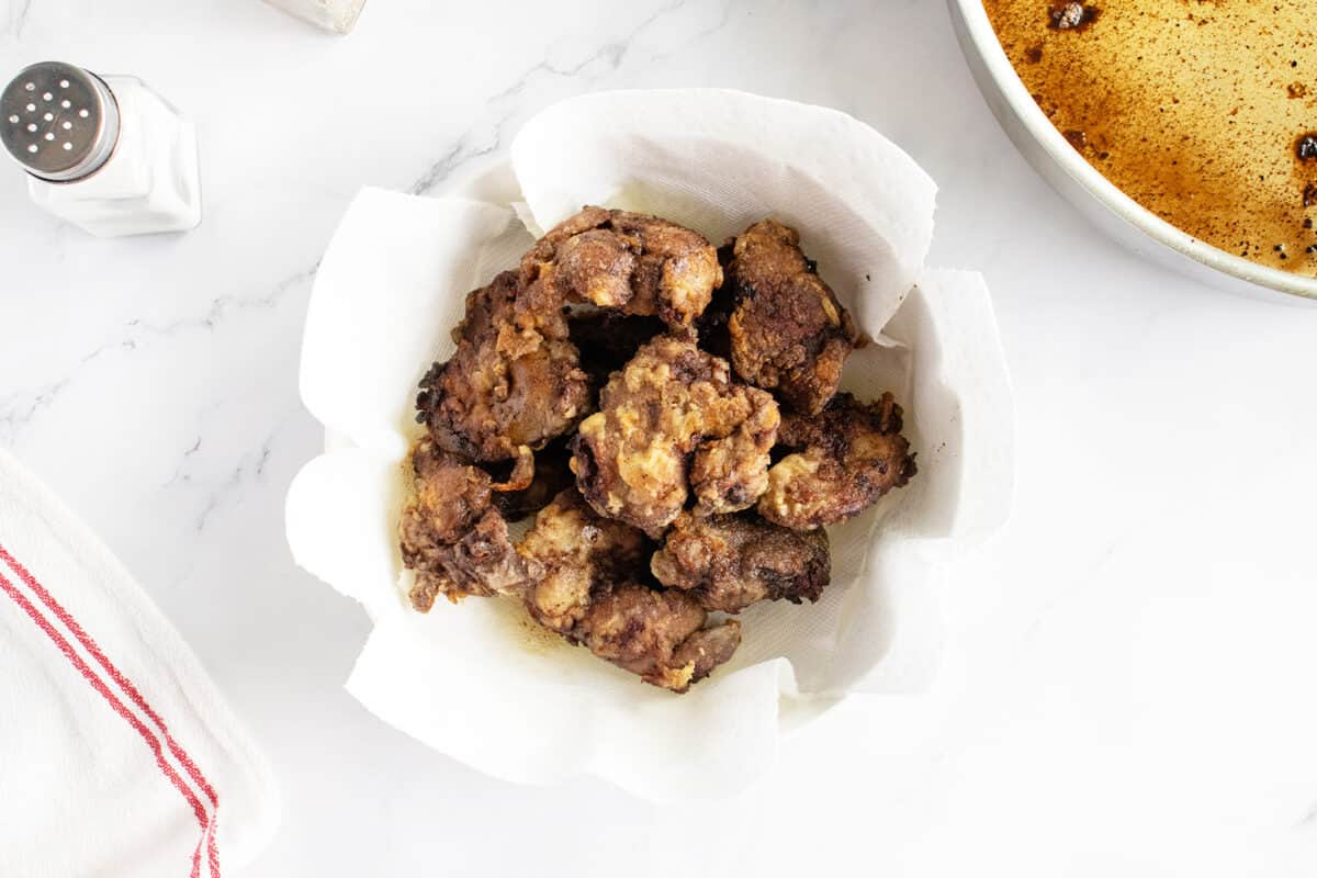 - Move cooked livers to dish lined with paper towel to absorb extra oil.