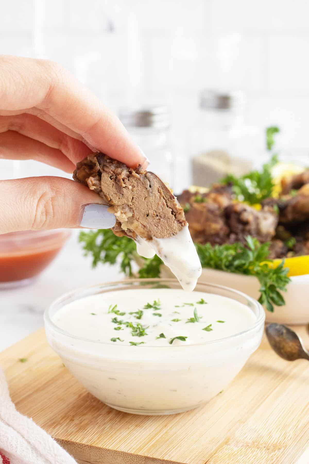 Serving Suggestions: Because chicken livers are quite rich, they pair well with lighter, brighter flavours. Apart from a classic ranch dressing or hot sauce, you may want to try a Tzatziki Sauce and some lemon slices. Sweet Chili Sauce would probably work well too. Any of these sauces will dress up a tray of appetizers, so have fun.
