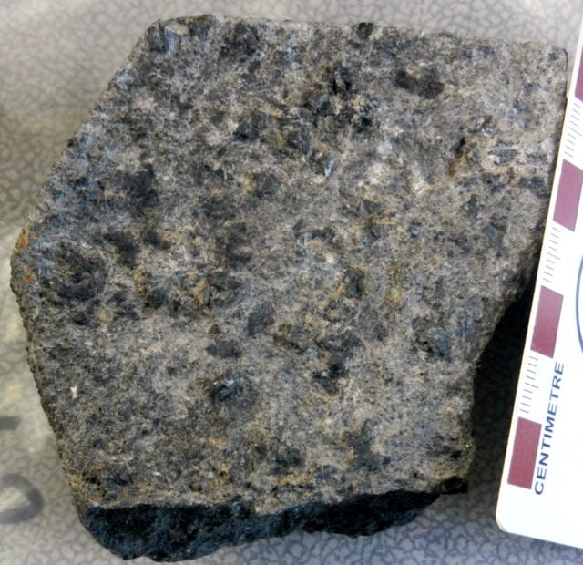 - Texture: Gabbro has a coarse-grained texture, with individual mineral grains visible to the naked eye. The grains are typically interlocking, giving the rock its characteristic appearance.