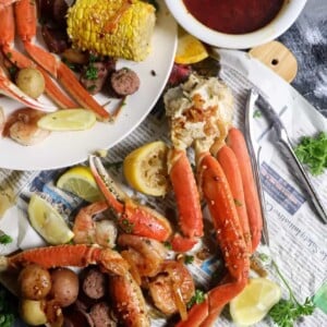 Garlic butter seafood boil with delicious sauce recipe. Full of fresh crab legs, shrimp, potatoes, corn, and sausage. With thousands of five star reviews, this is the best seafood boil recipe!
