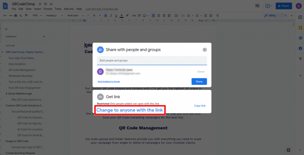 Haga clic en 'cambiar a cualquiera con el enlace' para asegurarse de que el documento tenga acceso para que lo vea cualquier persona.