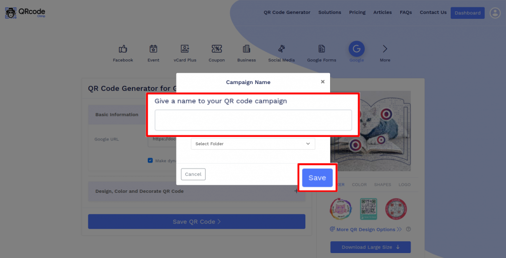 Guarde el código QR haciendo clic en el botón 'Guardar código QR', ingrese el nombre del QR y luego haga clic en 'Guardar'. Nota: Asegúrese de escanear su Código QR desde diferentes dispositivos (iOS y Android) antes de imprimir para producción.