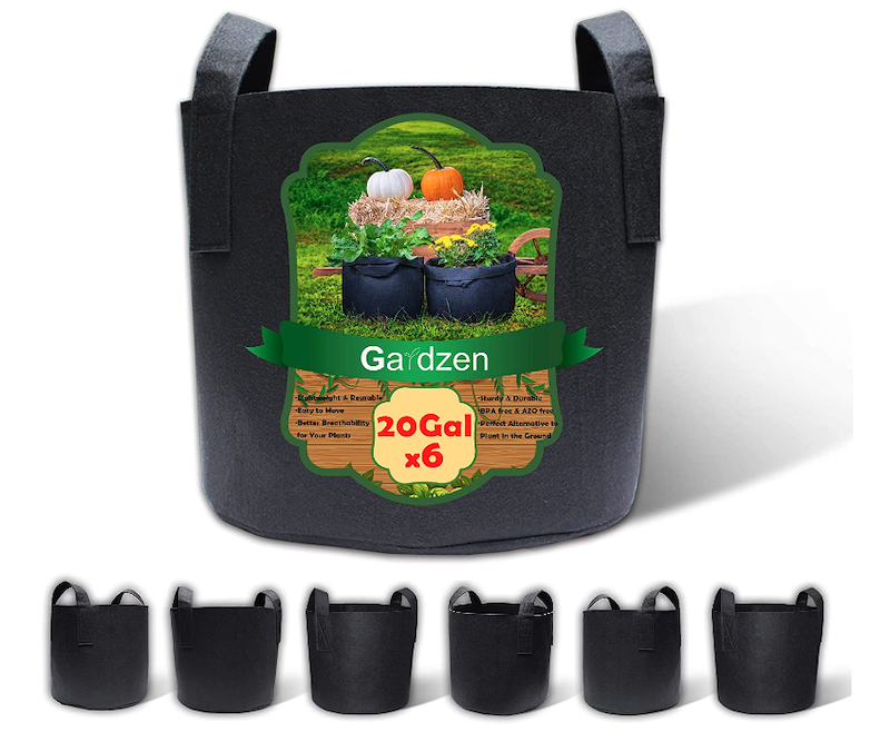| Gardzen 6-Pack 20 Gallon Grow Bags This is another great option! Made with sturdy, reinforced handles, and made of high-quality non-woven fabric. These grow bags provide excellent aeration and good air permeability. Comes in 1, 2, 3, 5, 7, 10, 20, 25 and 30 gallon sizes as well. *20 gallon size = 21.5" Diameter, 14.5" H Buy On Amazon ; |