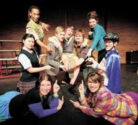 Students competing in the Putnam County Spelling Bee admire the "magic foot" of William Barfée's (middle, played by Josh Ray) in the Skagit Valley College production of "The 25th Annual Putnam County Spelling Bee." Pictured clockwise from bottom left: Clara Johnson, Asumi Oki, Ernest Tutt, Kelly Schultz, Josh Ray, David Logghe, Leisha Madden, Derrek Larson and Alisha Anderson.